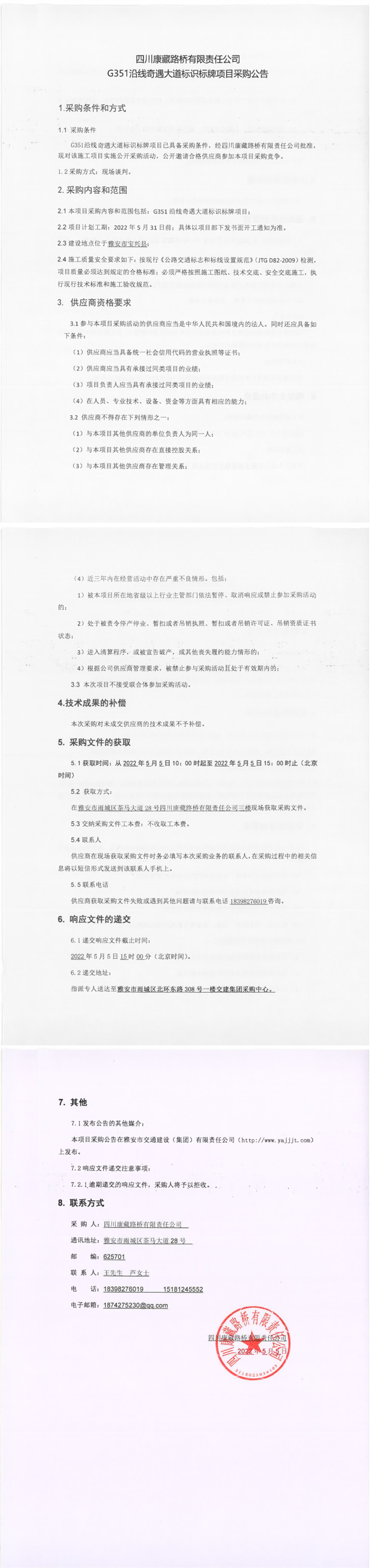 四川康藏路桥有限责任公司G351沿线奇遇大道标识标牌项目采购公告