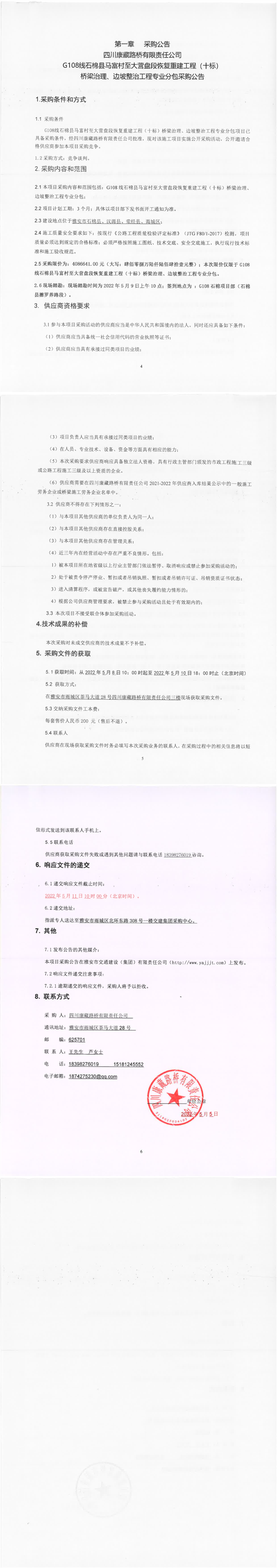 四川康藏路桥有限责任公司G108线石棉县马富村至大营盘段恢复重建工程(十标)桥梁治理、边坡整治工程专业分包采购公告
