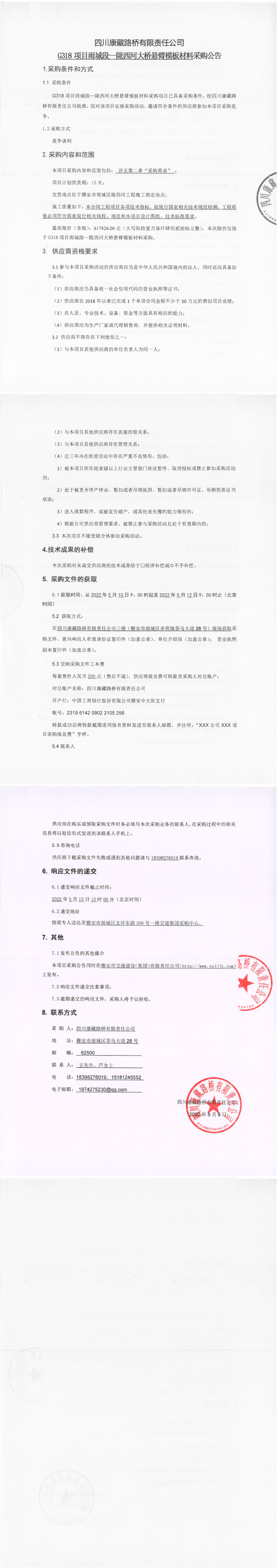 四川康藏路桥有限责任公司G318项目雨城段-陇西河大桥悬臂模板材料采购公告