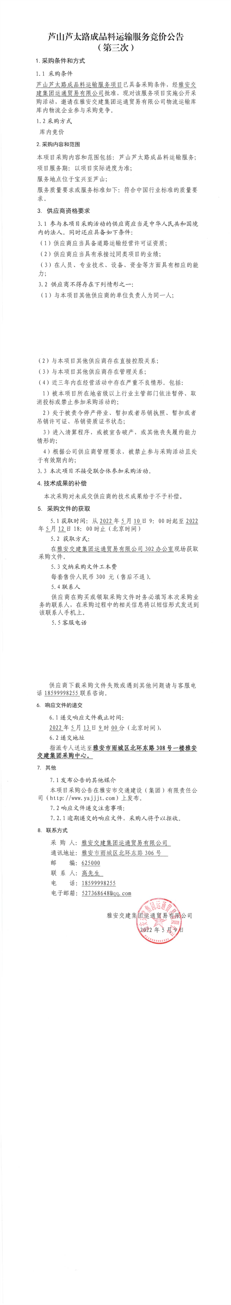 币游集团运通贸易有限公司芦山芦太路成品料运输服务竞价公告(第三次)