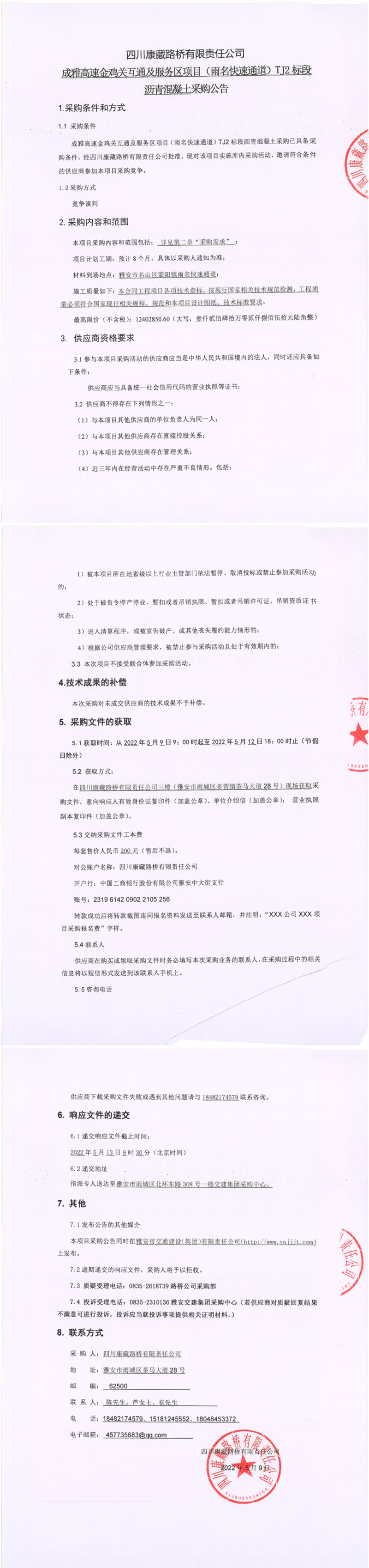 四川康藏路桥有限责任公司成雅高速金鸡关互通及服务区项目(雨名快速通道)TJ2标段沥青混凝土采购公告