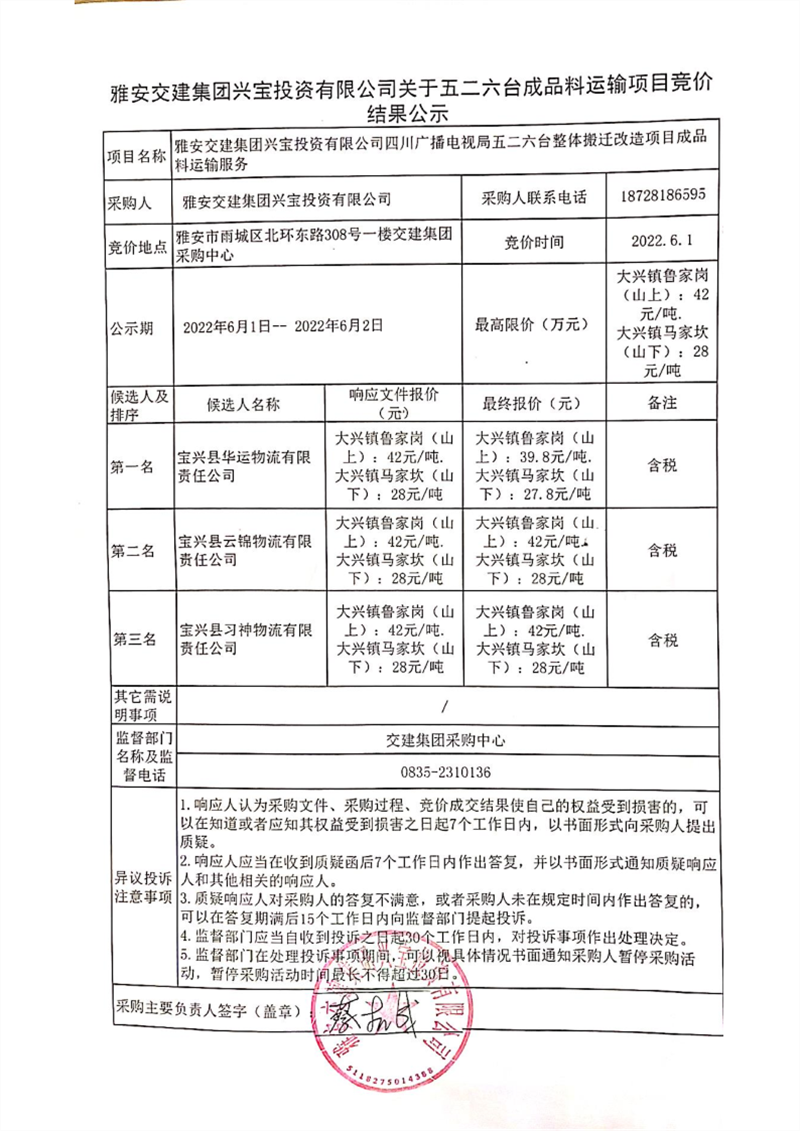 币游集团兴宝投资有限公司关于五二六台成品料运输项目竞价结果公示