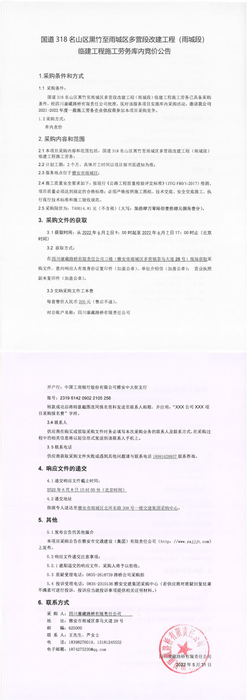 四川康藏路桥有限责任公司国道318名山区黑竹至雨城区多营段改建工程(雨城段)临建工程施工劳务库内竞价公告
