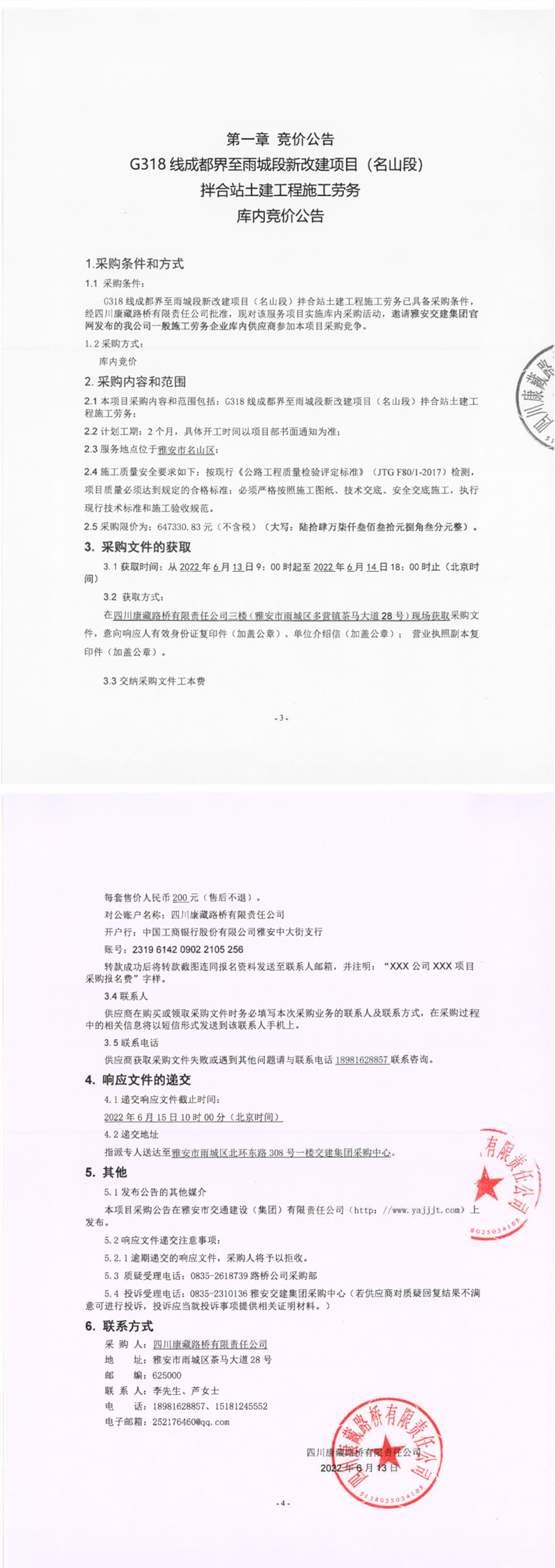 四川康藏路桥有限责任公司G318线成都界至雨城段新改建项目(名山段)拌合站土建工程施工劳务库内竞价公告