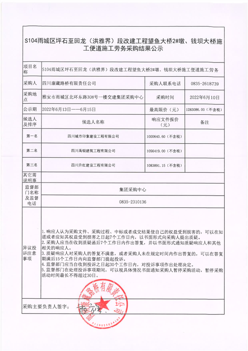 四川康藏路桥有限责任公司S104雨城区坪石至回龙(洪雅界)段改建工程望鱼大桥2#墩、钱坝大桥施工便道施工劳务采购结果公示