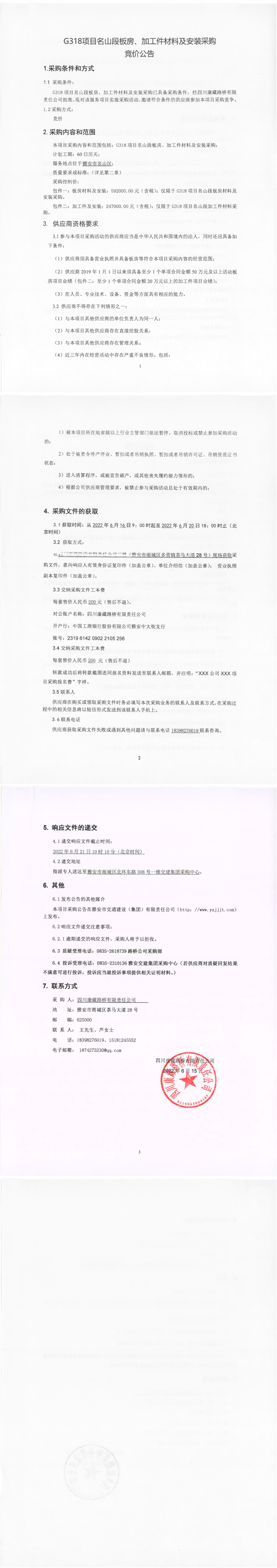 四川康藏路桥有限责任公司G318项目名山段板房、加工件材料及安装采购竞价公告