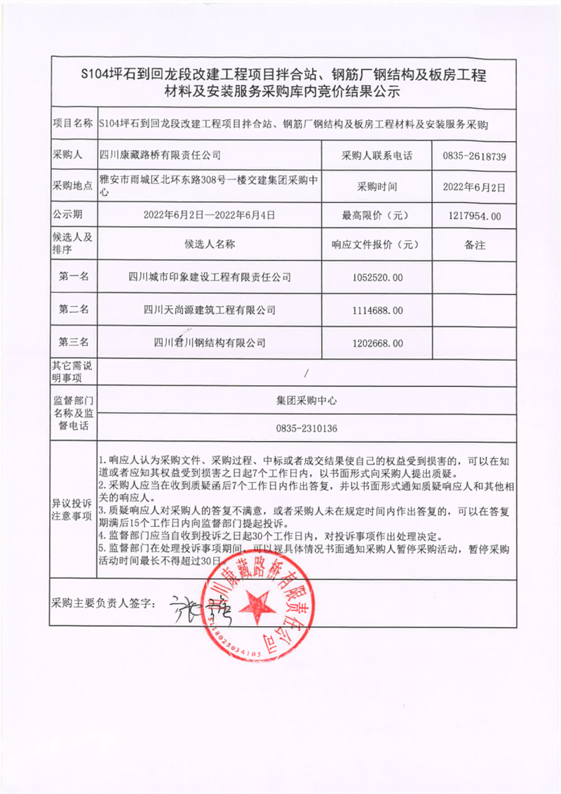 四川康藏路桥有限责任公司S104坪石到回龙段改建工程项目拌合站、钢筋厂钢结构及板房工程材料及安装服务库内竞价结果公示
