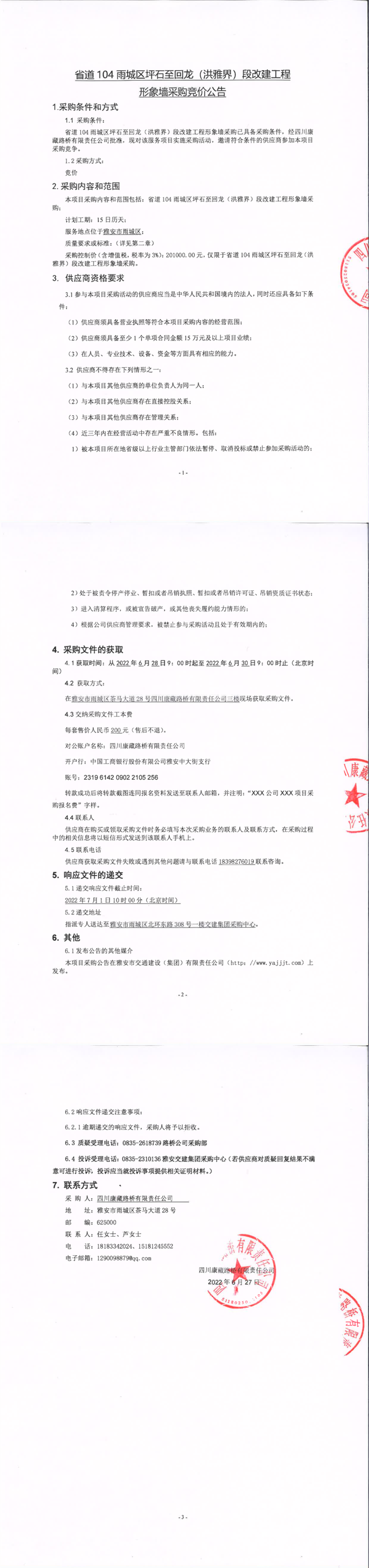 四川康藏路桥有限责任公司省道104雨城区坪石至回龙(洪雅界)段改建工程形象墙采购竞价公告
