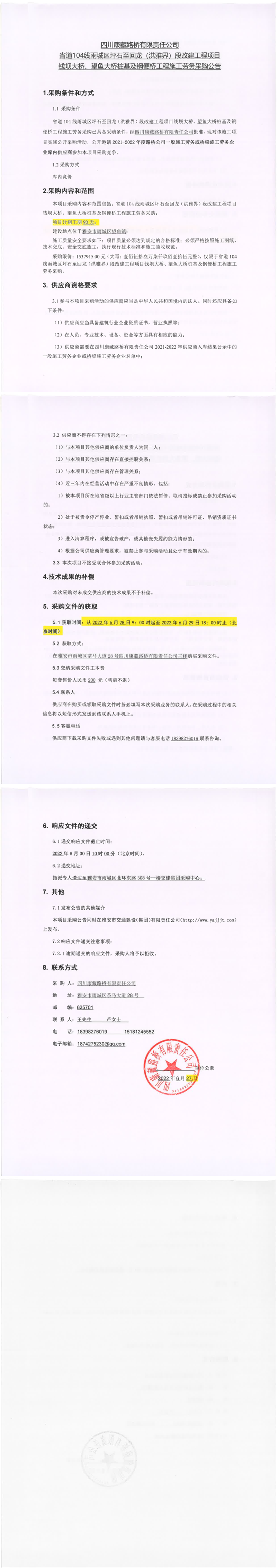 四川康藏路桥有限责任公司省道104线雨城区坪石至回龙(洪雅界)段改建工程项目钱坝大桥、望鱼大桥桩基及钢便桥工程施工劳务采购公告