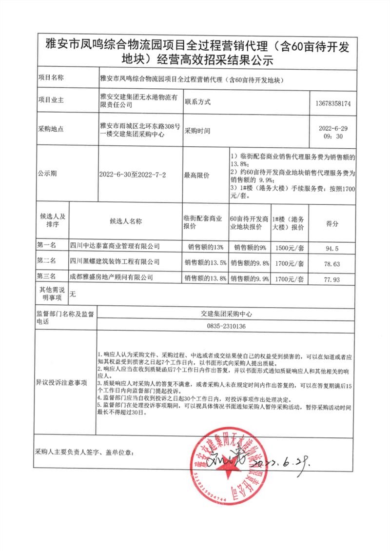 币游集团无水港物流有限责任公司雅安市凤鸣综合物流园项目全过程营销代理(含60亩待开发地块)经营高效招采结果公示