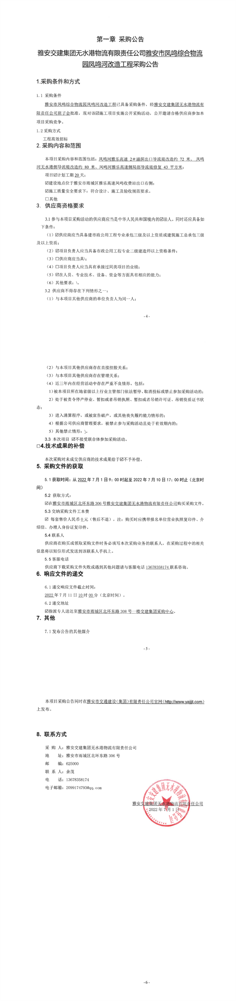 币游集团无水港物流有限责任公司雅安市凤鸣综合物流园凤鸣河改造工程采购公告