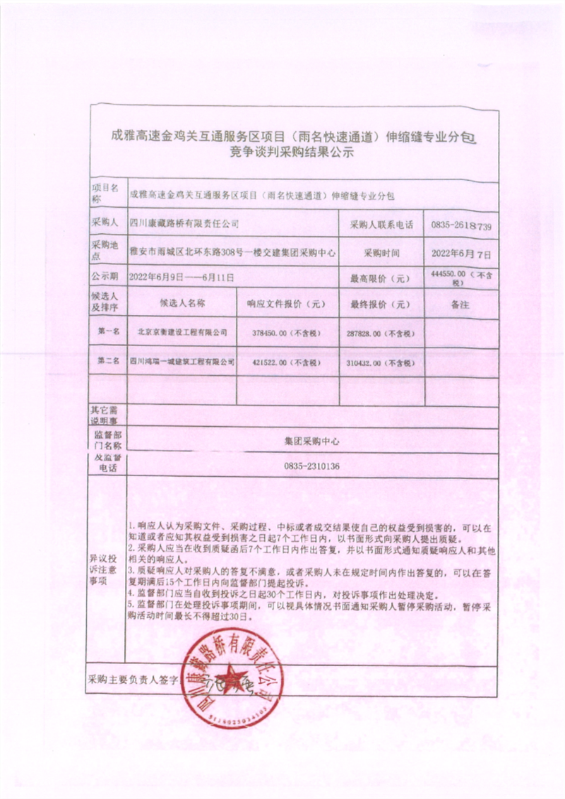 四川康藏路桥有限责任公司成雅高速金鸡关互通服务区项目(雨名快速通道)伸缩缝工程专业分包竞争谈判采购结果公示