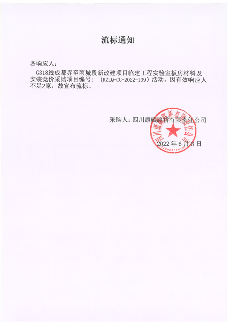 四川康藏路桥有限责任公司G318线成都界至雨城段新改建项目临建工程实验室板房材料及安装采购流标通知