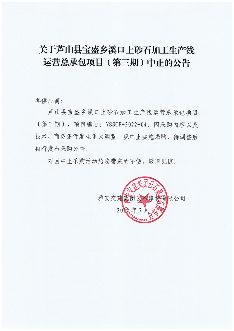 币游集团云石建材有限公司关于芦山县宝盛乡溪口上砂石加工生产线运营总承包项目(第三期)中止的公告