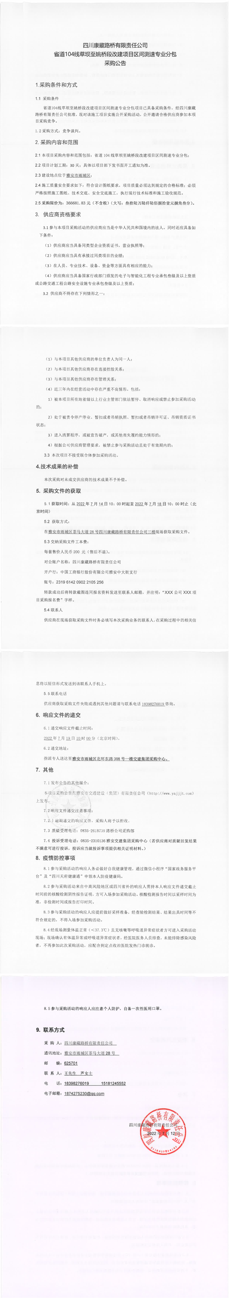 四川康藏路桥有限责任公司省道104线草坝至姚桥段改建项目区间测速专业分包采购公告