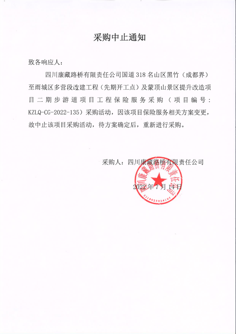 四川康藏路桥有限责任公司国道318名山区黑竹(成都界)至雨城区多营段改建工程(先期开工点)及蒙顶山景区提升改造项目二期步游道项目工程保险服务采购中止通知