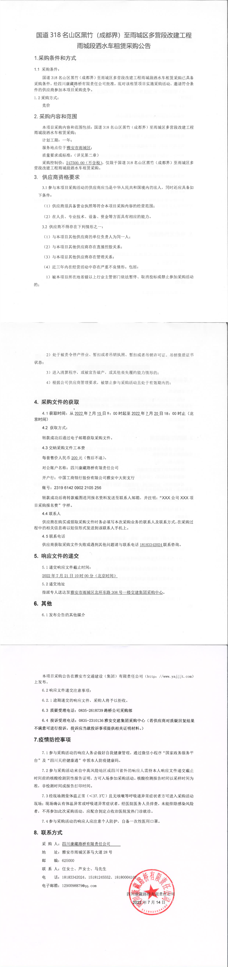 四川康藏路桥有限责任公司国道318名山区黑竹(成都界)至雨城区多营段改建工程雨城段洒水车租赁采购公告
