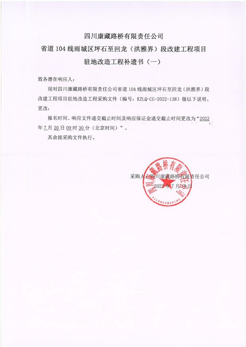 四川康藏路桥有限责任公司省道104线雨城区坪石至回龙(洪雅界)段改建工程项目驻地改造工程补遗书(一)