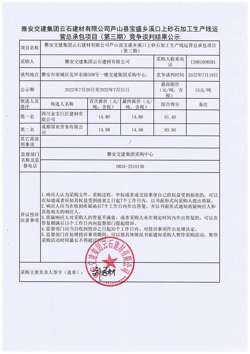 币游集团云石建材有限公司芦山县宝盛乡溪口上砂石加工生产线运营总承包项目(第三期)竞争谈判结果公示
