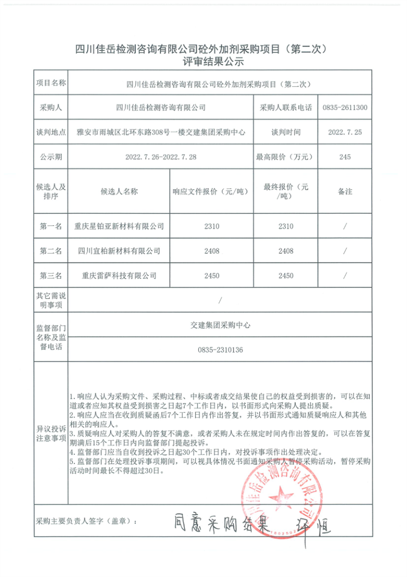 四川佳岳检测咨询有限公司砼外加剂采购项目(第二次)评审结果公示