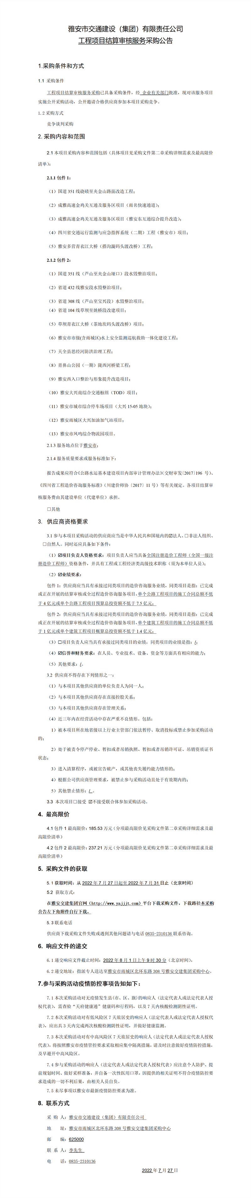 雅安市交通建设(集团)有限责任公司工程项目结算审核服务采购公告
