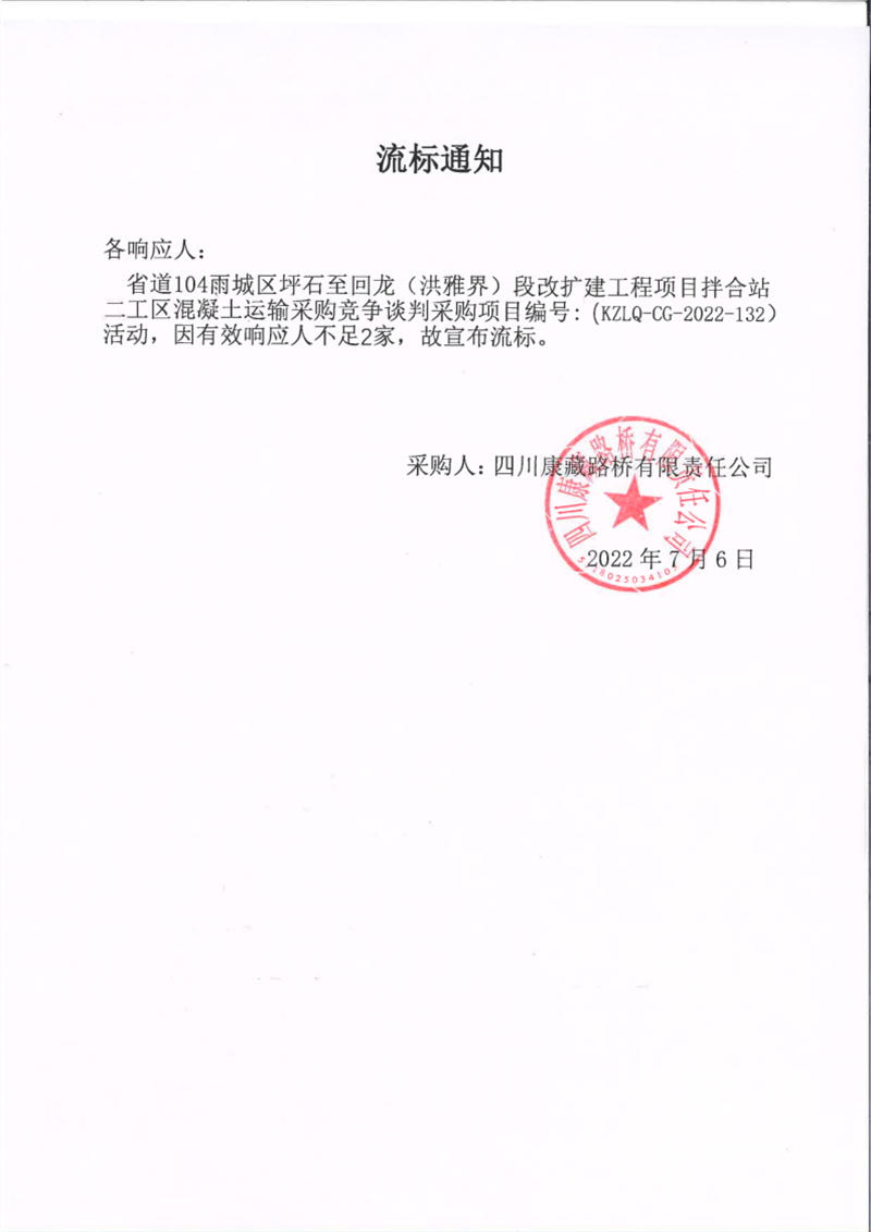 四川康藏路桥有限责任公司省道104线雨城区坪石至回龙(洪雅界)段改建工程项目拌合站二工区混凝土运输采购竞争谈判采购项目流标通知