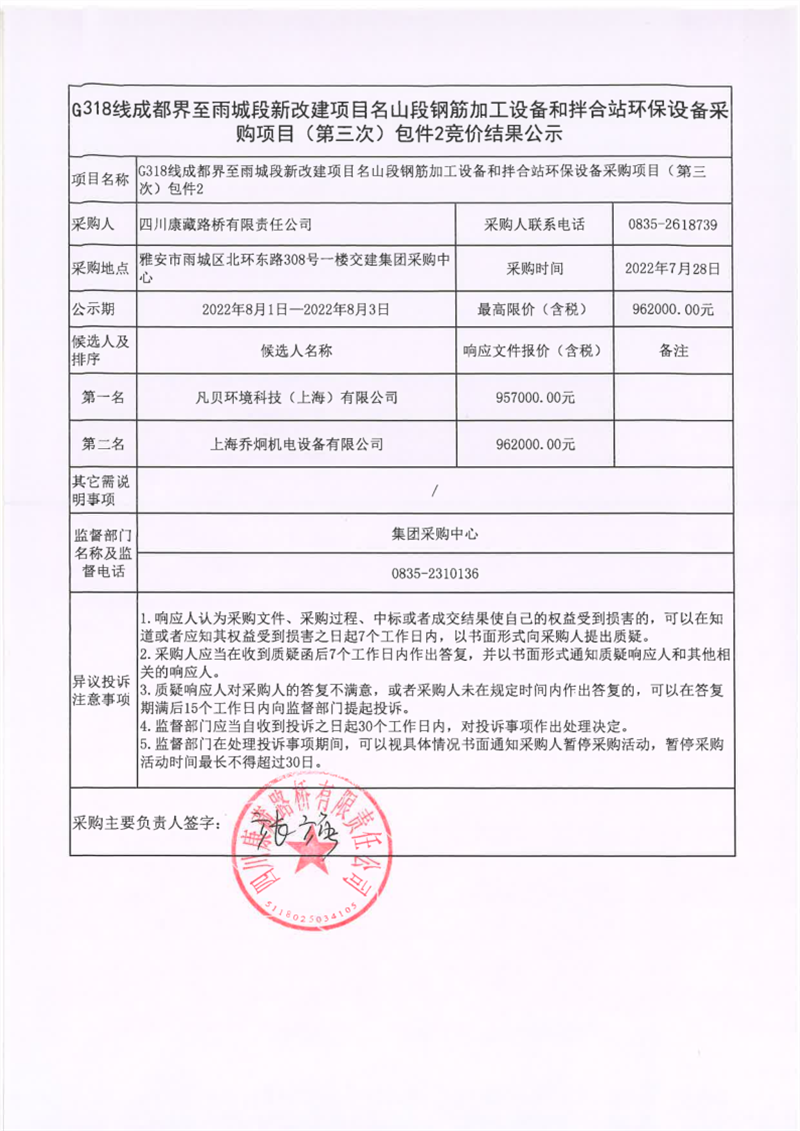 四川康藏路桥有限责任公司G318线成都界至雨城段新改建项目名山段钢筋加工设备和拌合站环保设备采购项目(第三次)包件2竞价结果公示