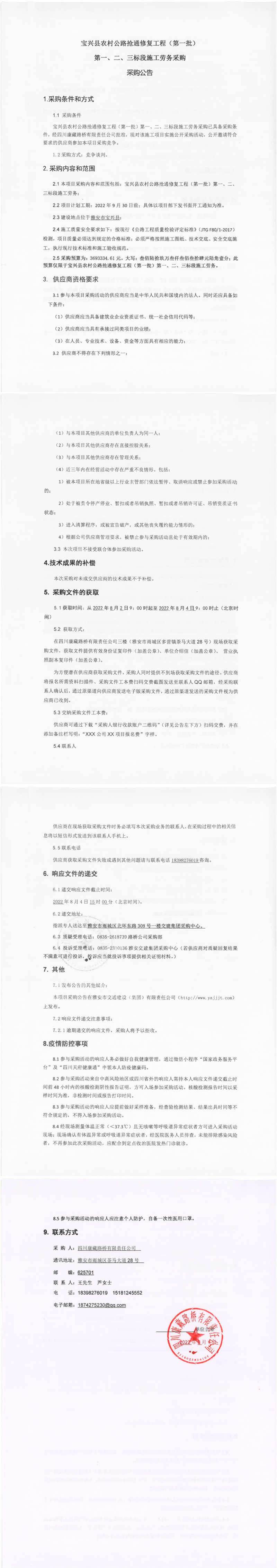 四川康藏路桥有限责任公司宝兴县农村公路抢通修复工程(第一批)第一、二、三标段施工劳务采购采购公告