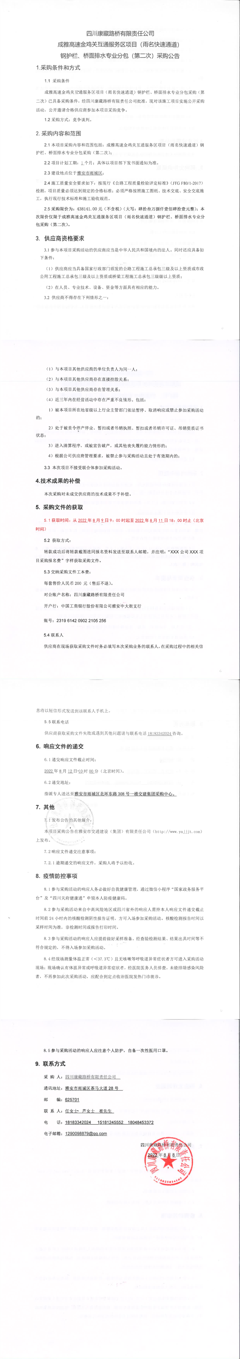 四川康藏路桥有限责任公司成雅高速金鸡关互通服务区项目(雨名快速通道)钢护栏、桥面排水工程专业分包(第二次)采购公告