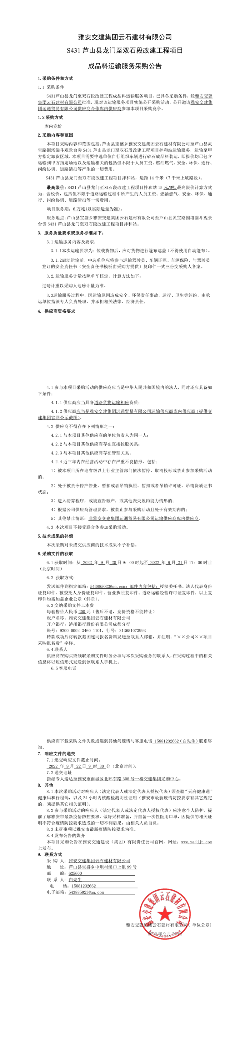 币游集团云石建材有限公司S431芦山县龙门至双石段改建工程项目成品料运输服务采购公告
