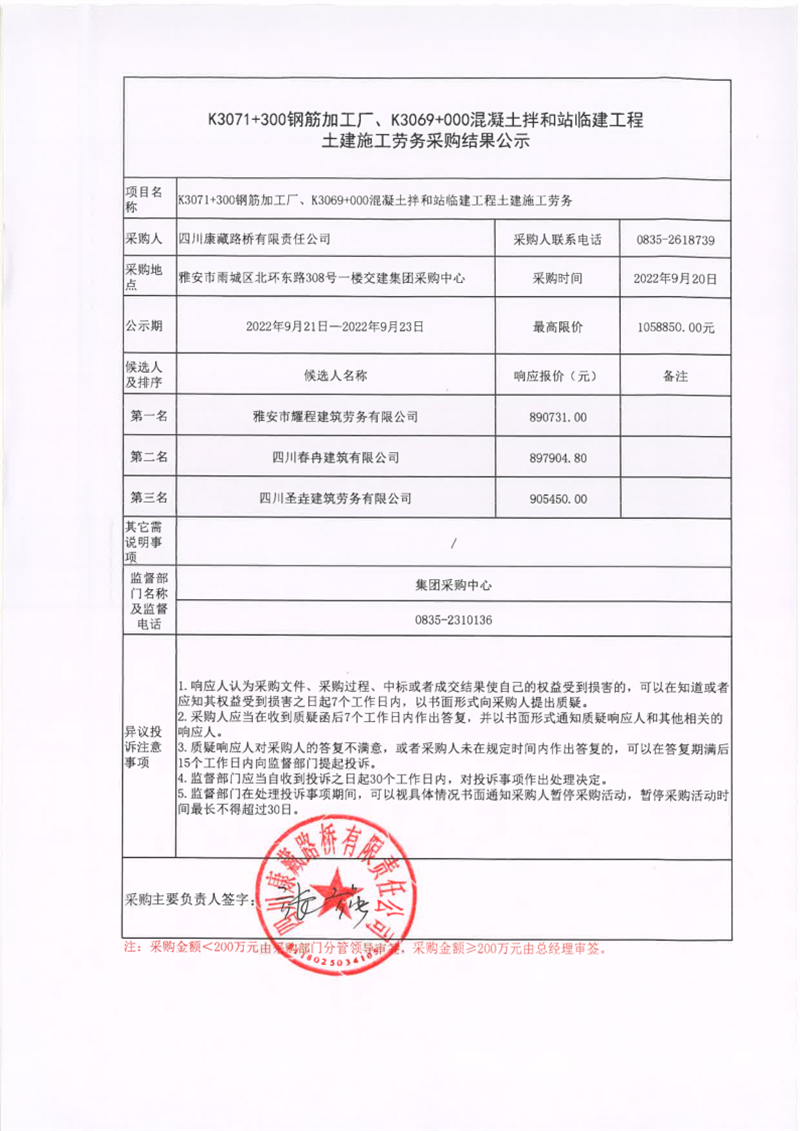 四川康藏路桥有限责任公司K3071+300钢筋加工厂、K309+000混凝土拌和站临建工程土建施工劳务采购结果公示