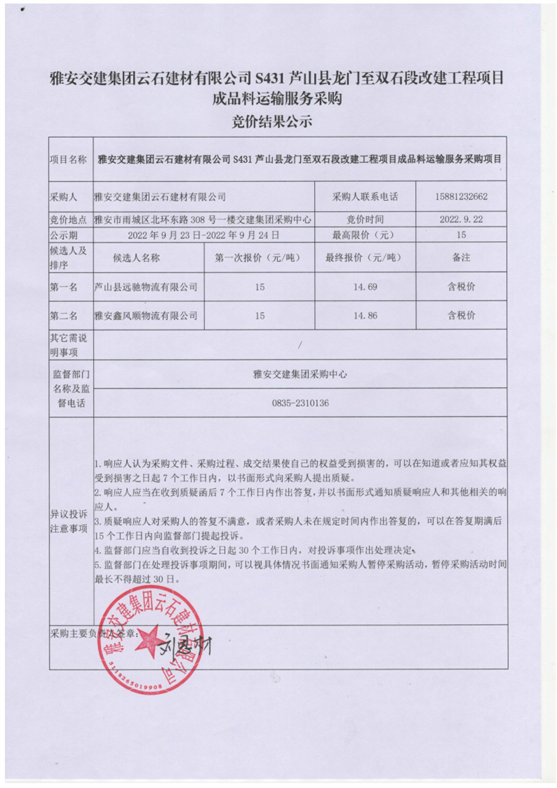 币游集团云石建材有限公司S431芦山县龙门至双石段改建工程项目成品料运输服务采购竞价结果公示