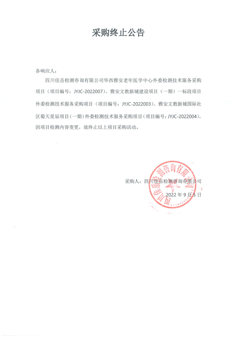 四川佳岳检测咨询有限公司采购项目(项目编号:JYJC-2022007、JYJC-2022003、JYJC-2022004)采购中止公告
