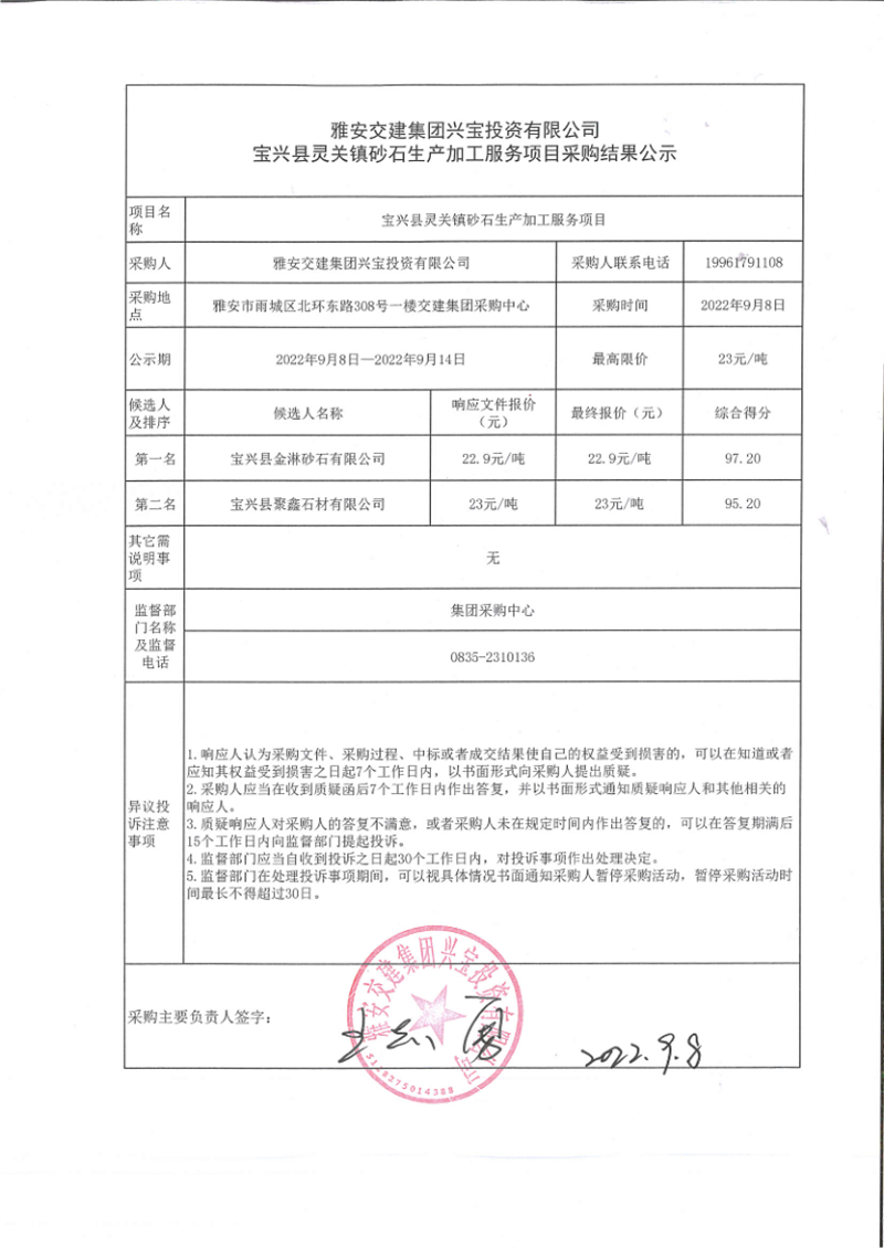 币游集团兴宝投资有限公司宝兴县灵关镇砂石生产加工服务项目采购结果公示