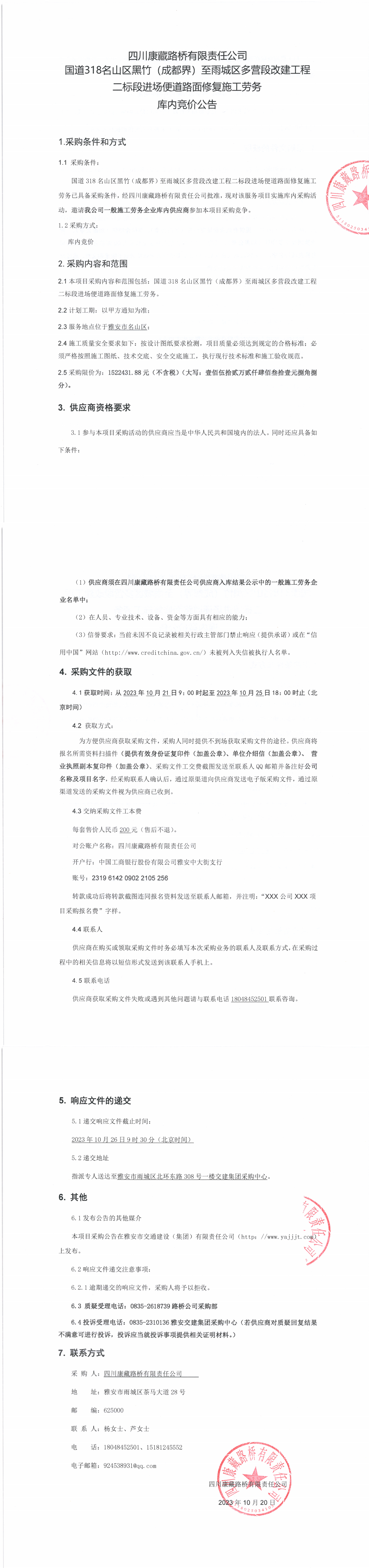 四川康藏路桥有限责任公司国道318名山区黑竹(成都界)至雨城区多营段改建工程二标段进场便道路面修复施工劳务库内竞价公告