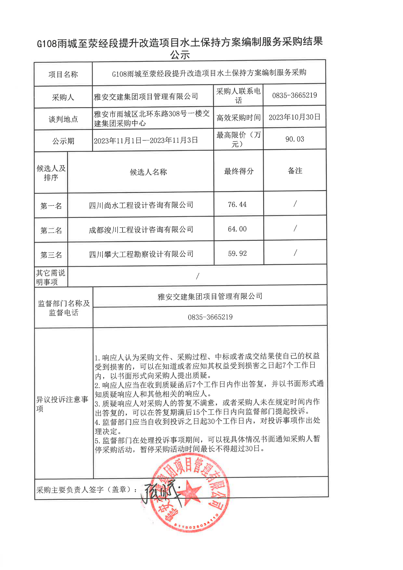 币游集团项目管理有限公司G108雨城至荥经段提升改造项目水土保持方案编制服务采购结果公示