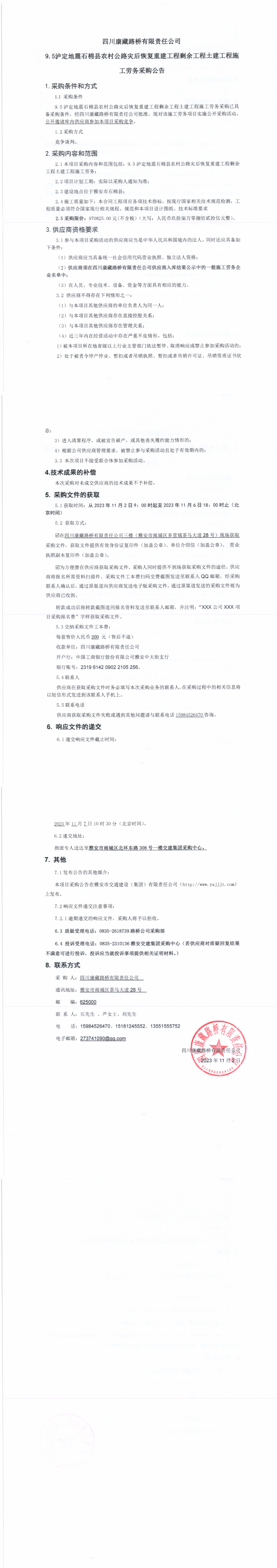 四川康藏路桥有限责任公司 9.5泸定地震石棉县农村公路灾后恢复重建工程剩余工程土建工程施工劳务采购公告