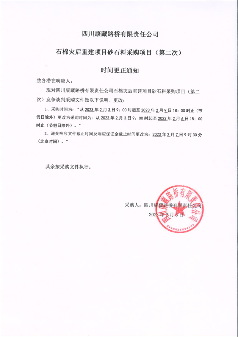 四川康藏路桥有限责任公司石棉灾后重建项目砂石料采购项目(第二次)时间更正通知