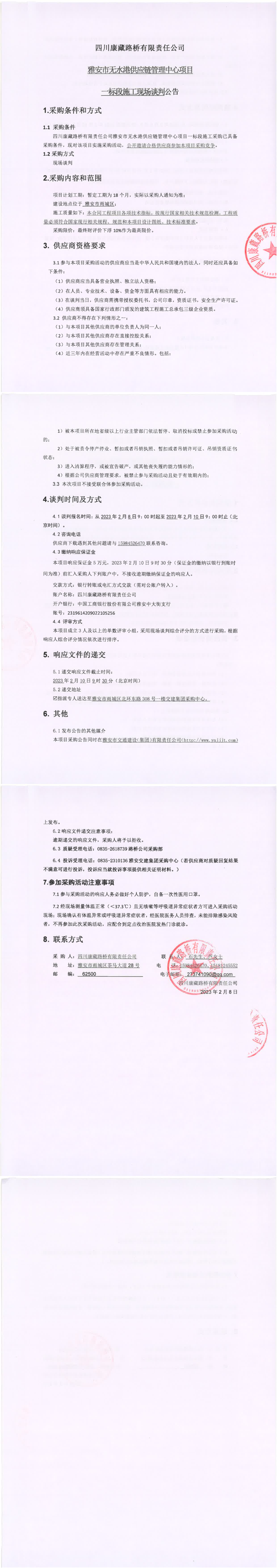 四川康藏路桥有限责任公司雅安市无水港供应链管理中心项目一标段施工现场谈判公告