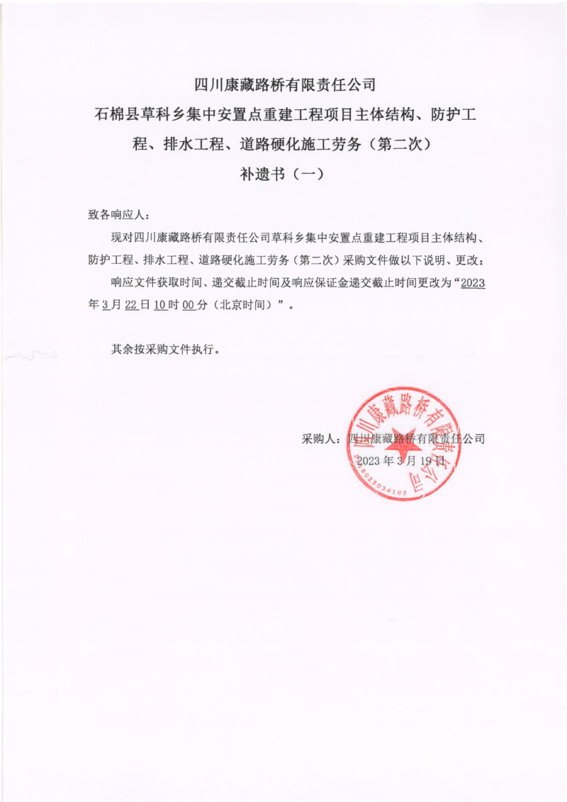 四川康藏路桥有限责任公司石棉县草科乡集中安置点重建工程项目主体结构、防护工程、排水工程、道路硬化施工劳务(第二次)补遗书(一)