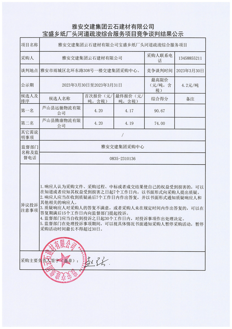 币游集团云石建材有限公司宝盛乡纸厂头河道疏浚综合服务项目竞争谈判结果公示