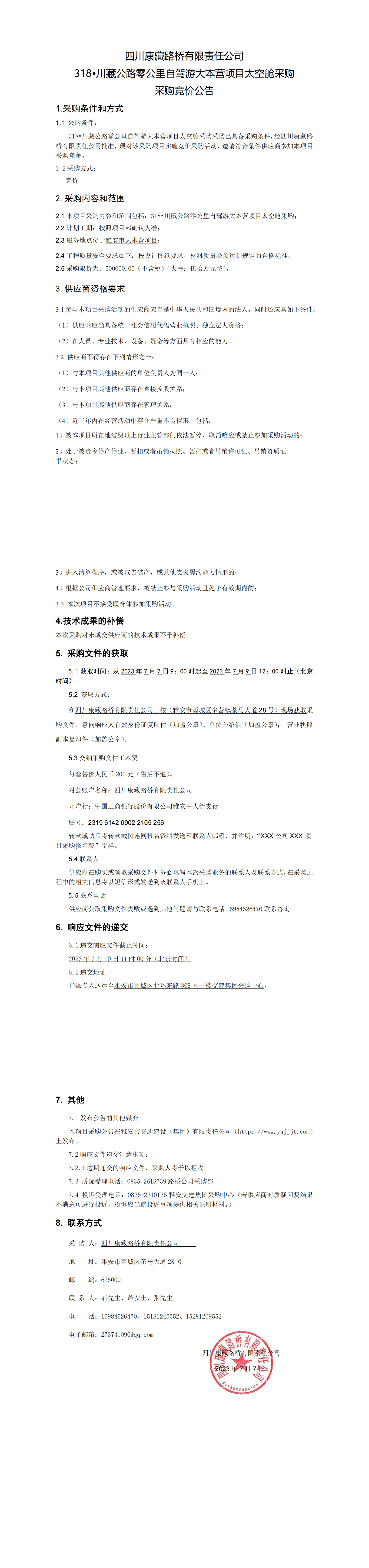 四川康藏路桥有限责任公司318·川藏公路零公里自驾游大本营项目太空舱采购竞价公告