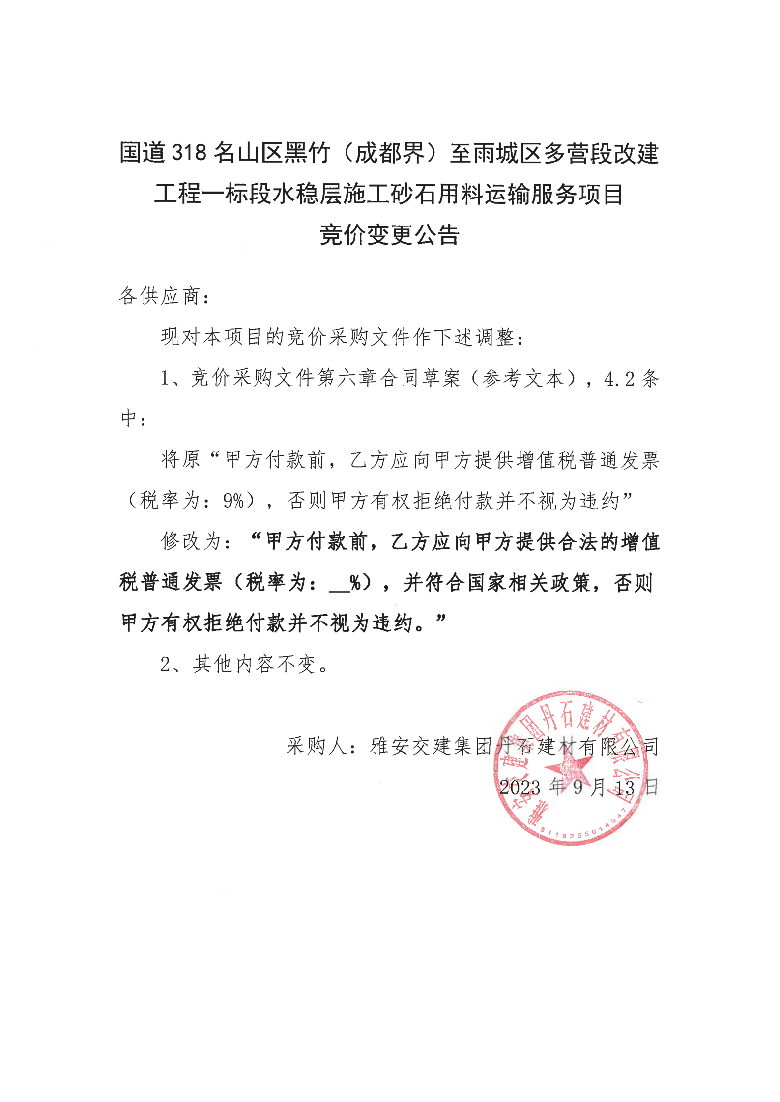 币游集团丹石建材有限公司国道318名山区黑竹(成都界)至雨城区多营段改建工程一标段水稳层施工砂石用料运输服务项目竞价变更公告
