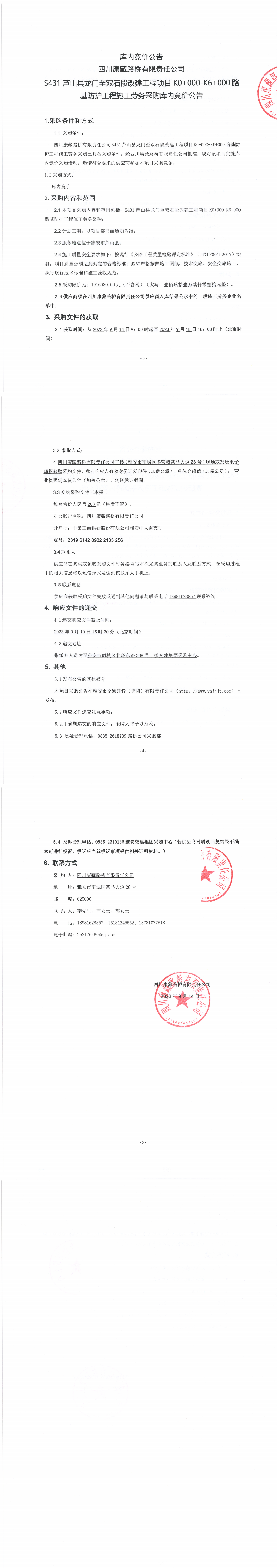 四川康藏路桥有限责任公司S431芦山县龙门至双石段改建工程项目K0+000-K6+000路基防护工程施工劳务采购公告