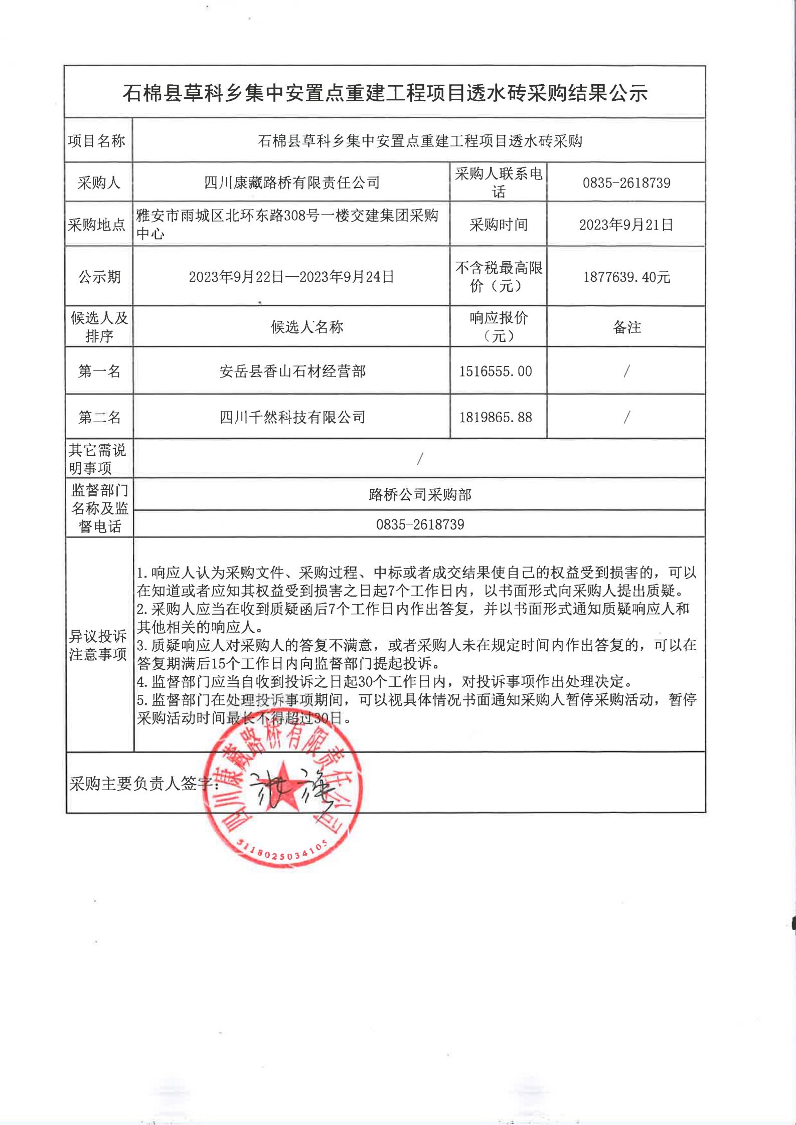 四川康藏路桥有限责任公司石棉县草科乡集中安置点重建工程项目透水砖采购结果公示