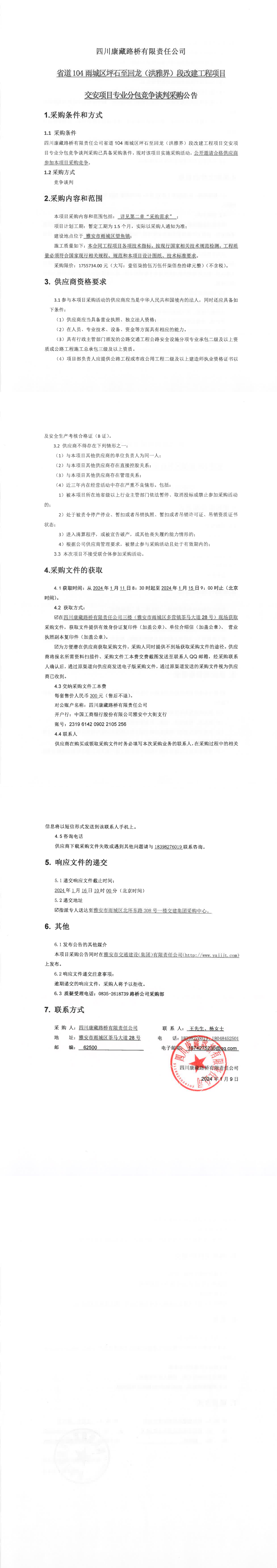 四川康藏路桥有限责任公司省道104雨城区坪石至回龙(洪雅界)段改建工程项目交安项目专业分包竞争谈判采购公告