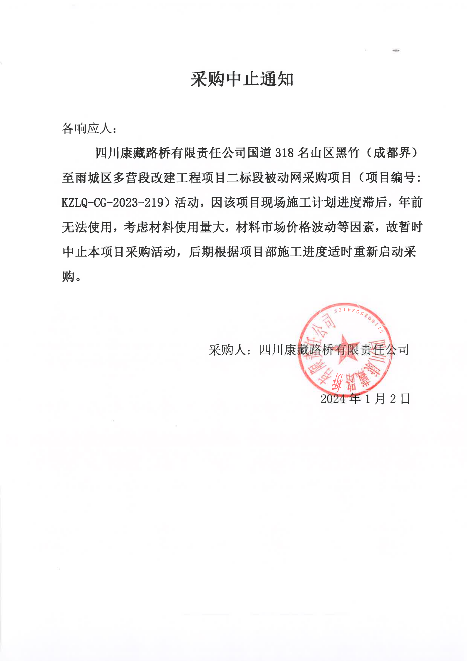 四川康藏路桥有限责任公司国道318名山区黑竹(成都界)至雨城区多营段改建工程项目二标段被动网采购项目采购中止通知