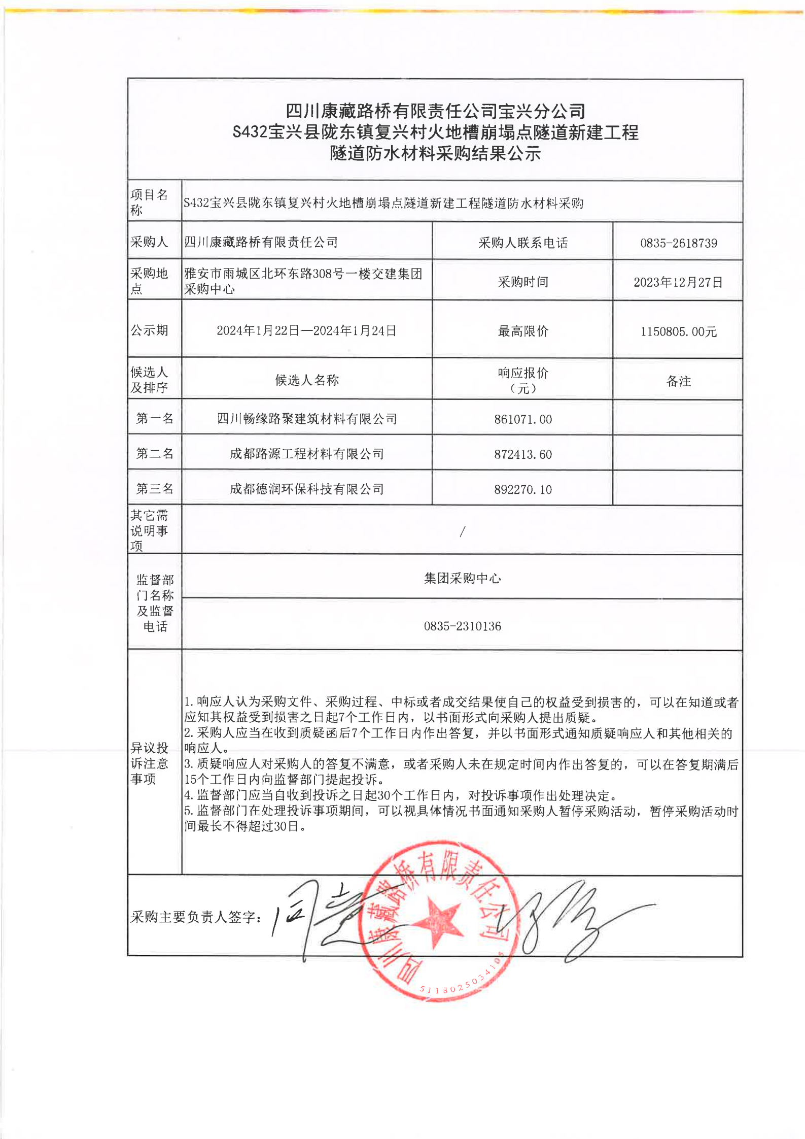 四川康藏路桥有限责任公司宝兴分公司S432宝兴县陇东镇复兴村火地槽崩塌点隧道新建工程隧道防水材料采购结果公示