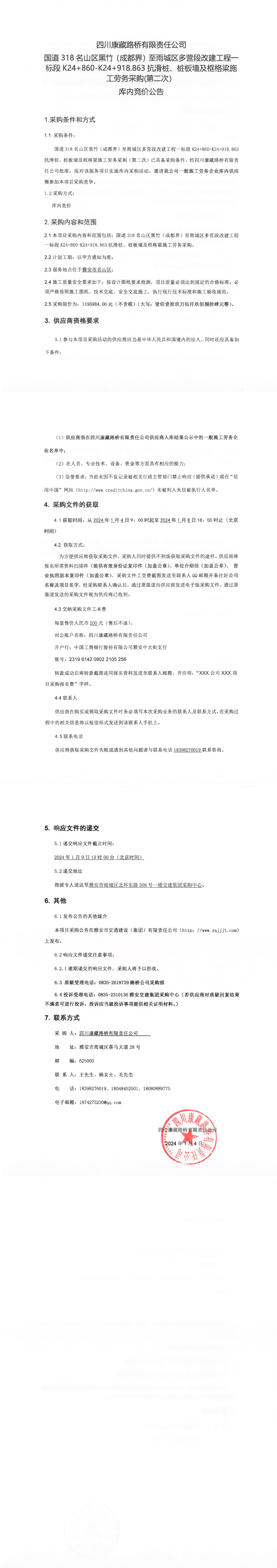 四川康藏路桥有限责任公司国道318名山区黑竹(成都界)至雨城区多营段改建工程一标段K24+860-K24+918.863抗滑桩、桩板墙及框格梁施工劳务采购(第二次)库内竞价公告