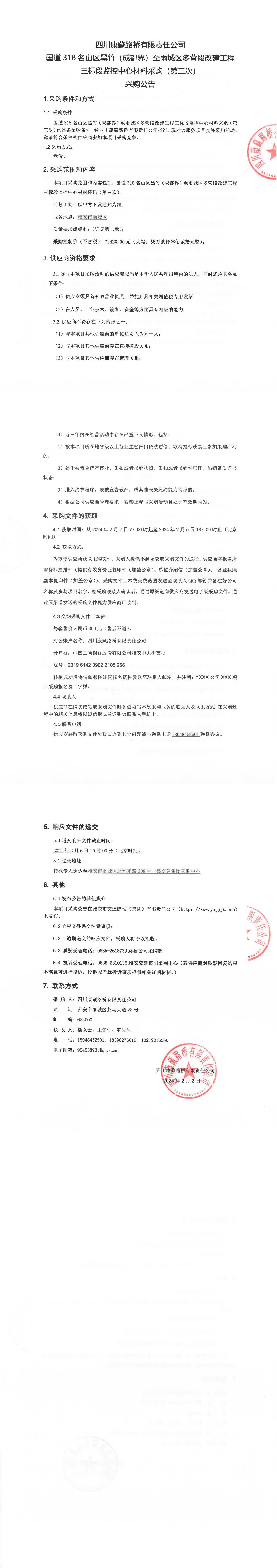 四川康藏路桥有限责任公司国道318名山区黑竹(成都界)至雨城区多营段改建工程三标段监控中心材料采购(第三次)采购公告